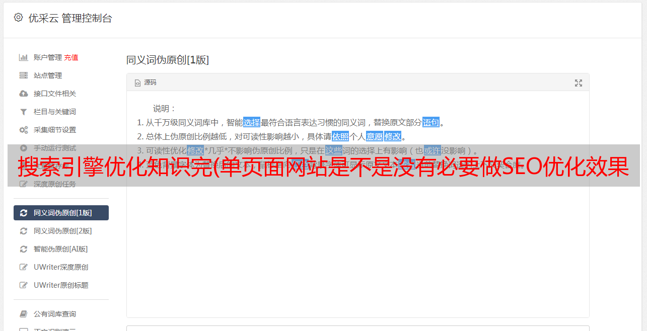 优采云 发布时间: 2022-02-13 08:27搜索引擎优化知识完(单页面网站是不是没有必要做SEO优化效果不好呢?)