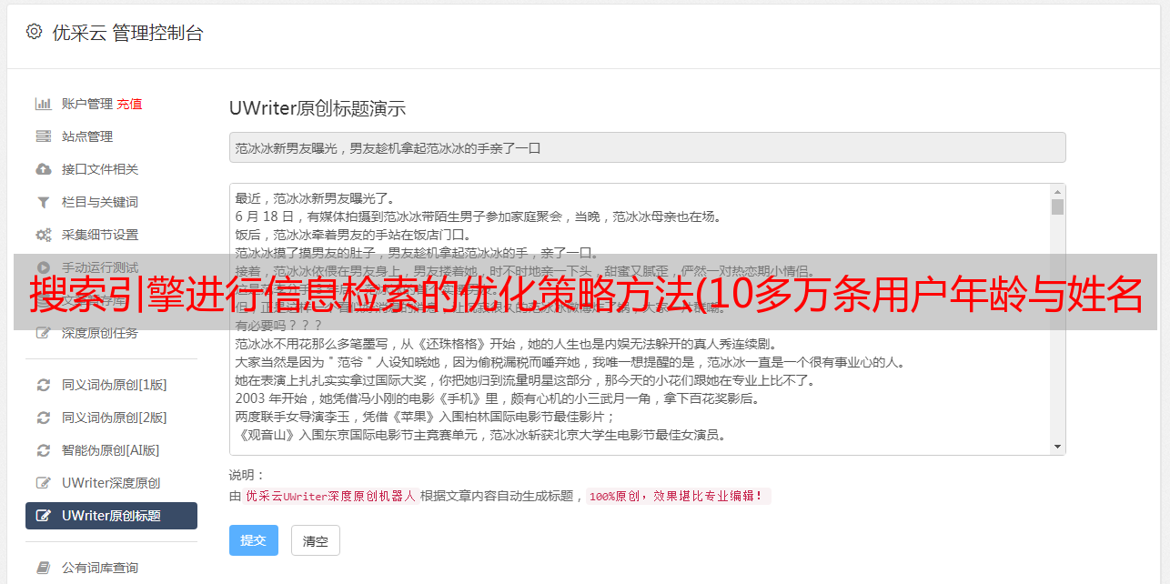 优采云 发布时间: 2022-02-15 02:11搜索引擎进行信息检索的优化策略方法(10多万条用户年龄与姓名联合索引的处理以及自我要求