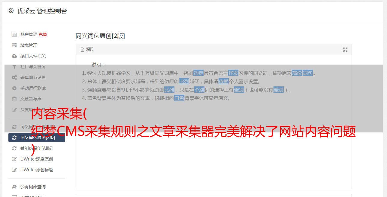 多种伪原创和优化方法来提高收录率和关键词排名:自动标题、段落重排、高级混淆、自动内部链接、内容过滤、URL过滤和同义词替换等方法提升采集文章原创性能,提升搜索引擎收录、网站权重和关键词排名。