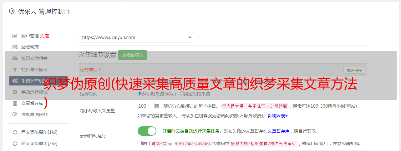 这个织梦采集插件不需要学习更多的专业技能,只需要简单几步就可以轻松搞定采集内容数据,用户只需要添加织梦采集 在插件上进行了简单的设置。完成后,织梦采集插件会根据用户设置的关键词,对内容和图片进行高精度匹配。您可以选择保存在本地,也可以选择伪原创发布后,提供方便快捷的内容采集伪原创发布服务!!