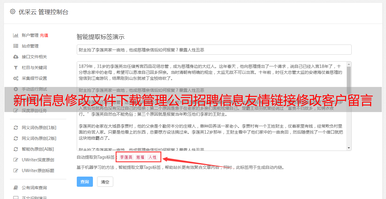 优采云 发布时间: 2021-05-04 02:03新闻信息修改文件下载管理公司招聘信息友情链接修改客户留言