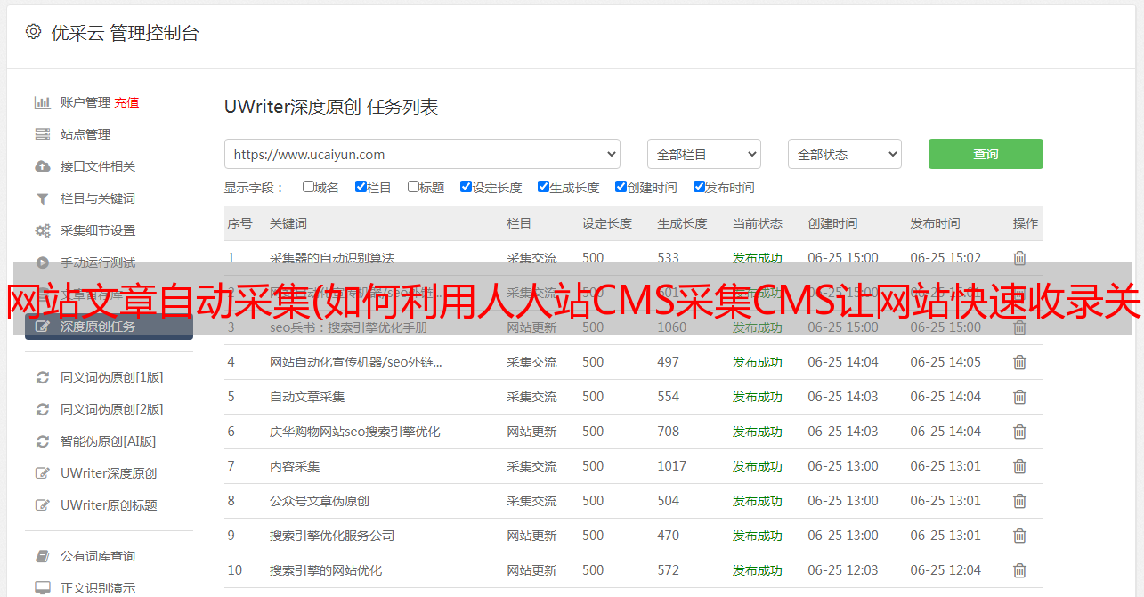 本人人站cms采集无需学习更多专业技能,简单几步即可轻松采集内容数据,用户只需在人人站cms对采集进行简单设置,完成后人人站cms采集会根据用户设置的关键词进行内容和图片的高精度匹配。您可以选择在伪原创之后发布,提供方便快捷的内容采集伪原创发布服务!!
