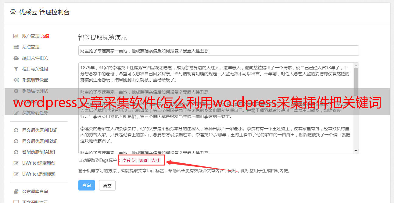 与其他采集插件相比,基本没有门槛,也不需要花很多时间学习正则表达式或者html标签,一分钟就能上手,输入关键词即可实现采集。(wordpress插件还自带关键词生成功能) 一路挂断!设置任务自动执行采集发布任务。