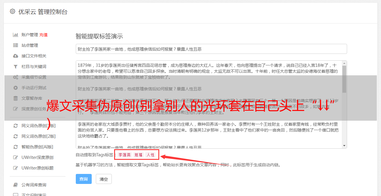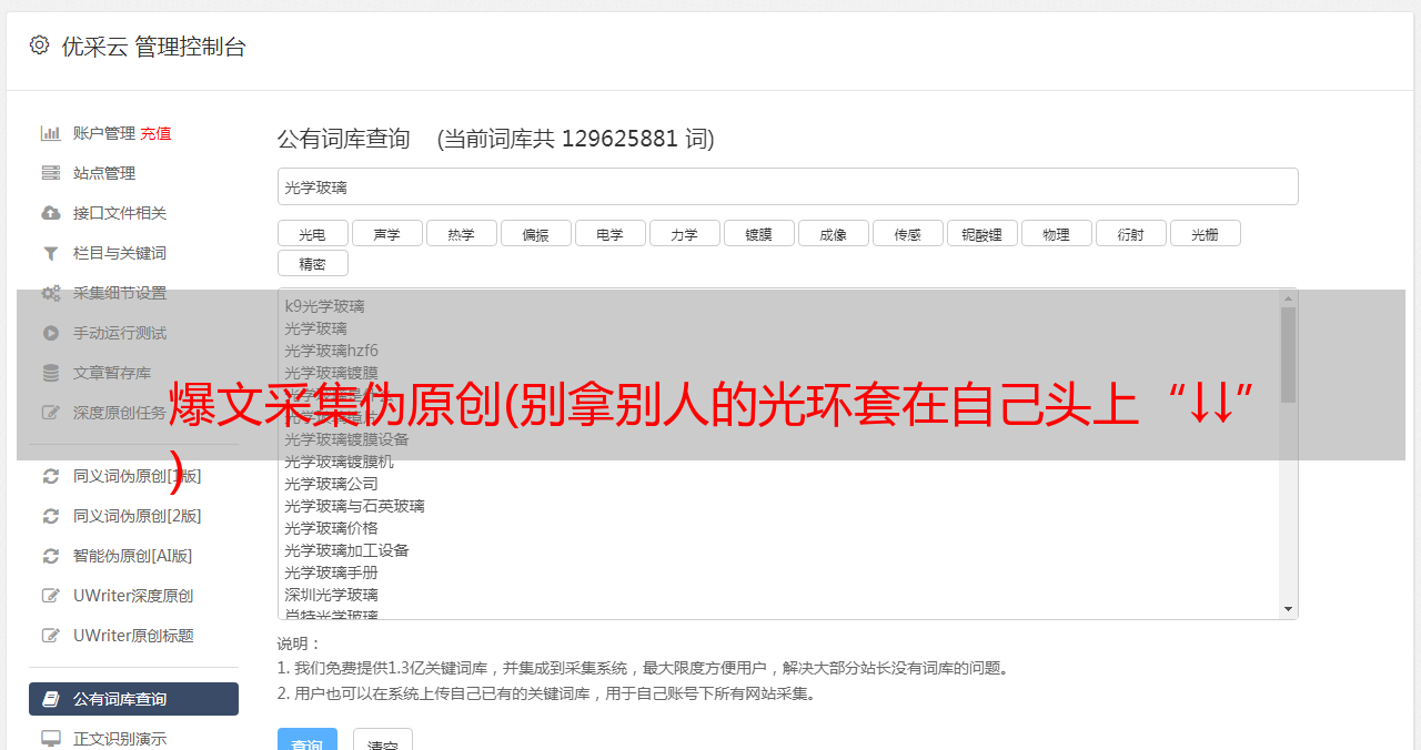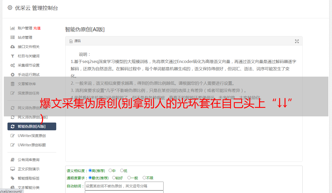 功能:1.这个伪原创工具是一个SEOER工具,专门用来生成原创和伪原创文章的工具,使用伪原创工具可以瞬间把网上复制的文章变成原创文章。