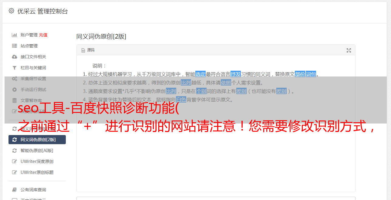 seo工具-百度快照诊断功能( 之前通过“+”进行识别的网站请注意!您需要修改识别方式,新的正确的识别Baiduspider)