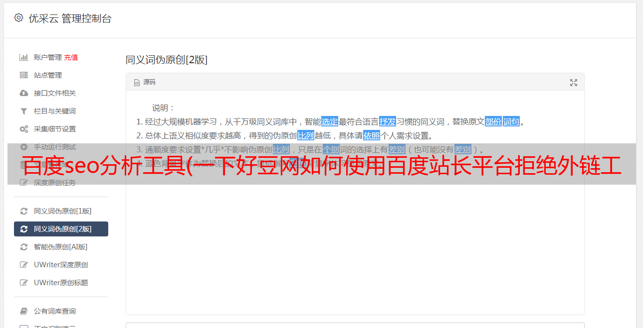 优采云 发布时间: 2022-02-23 08:14百度seo分析工具(一下好豆网如何使用百度站长平台拒绝外链工具的方法与示范)