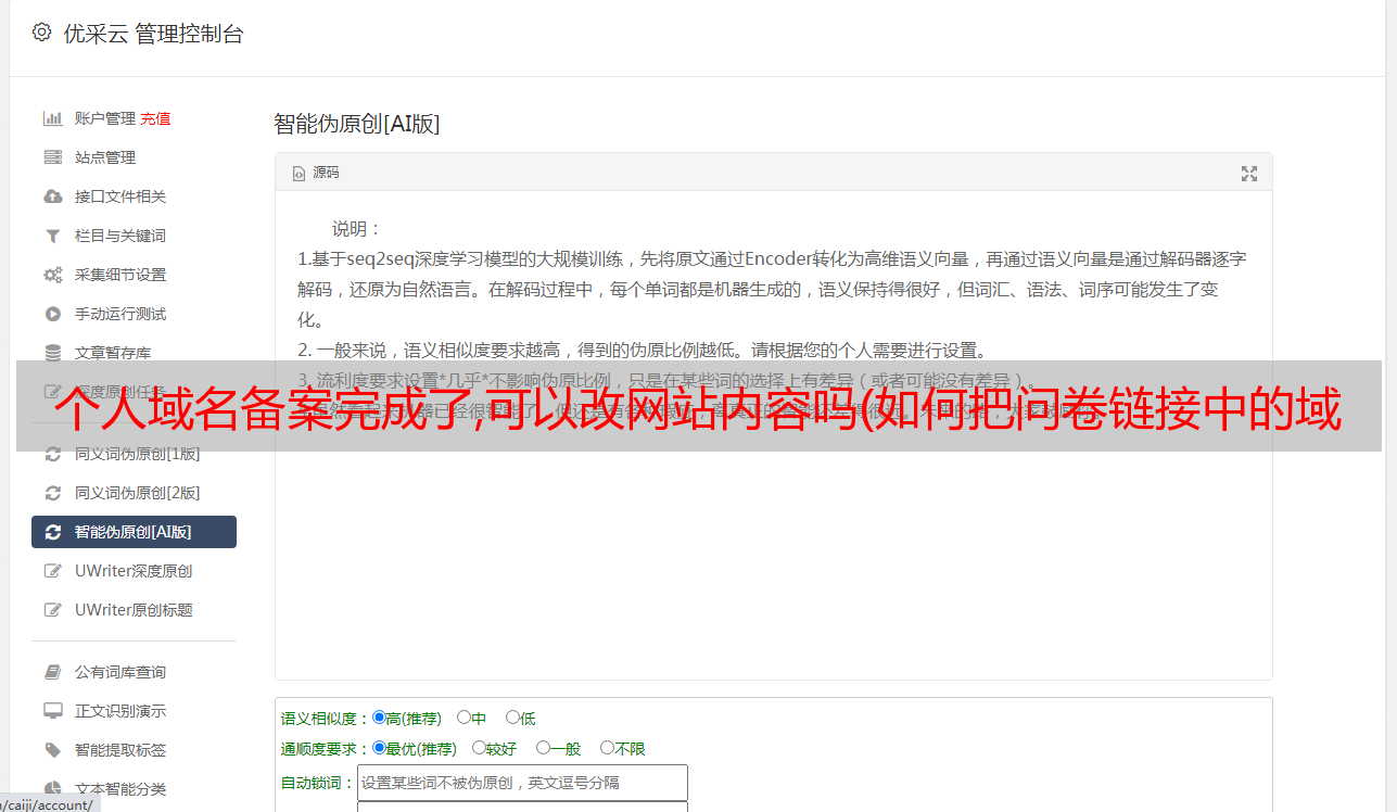 优采云 发布时间: 2022-02-23 18:12个人域名备案完成了,可以改网站内容吗(如何把问卷链接中的域名改成自己的自定义域名?)