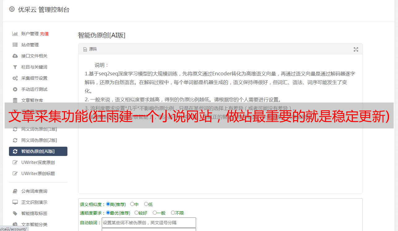 优采云 发布时间: 2022-02-23 23:17文章采集功能(狂雨建一个小说网站,做站最重要的就是稳定更新)