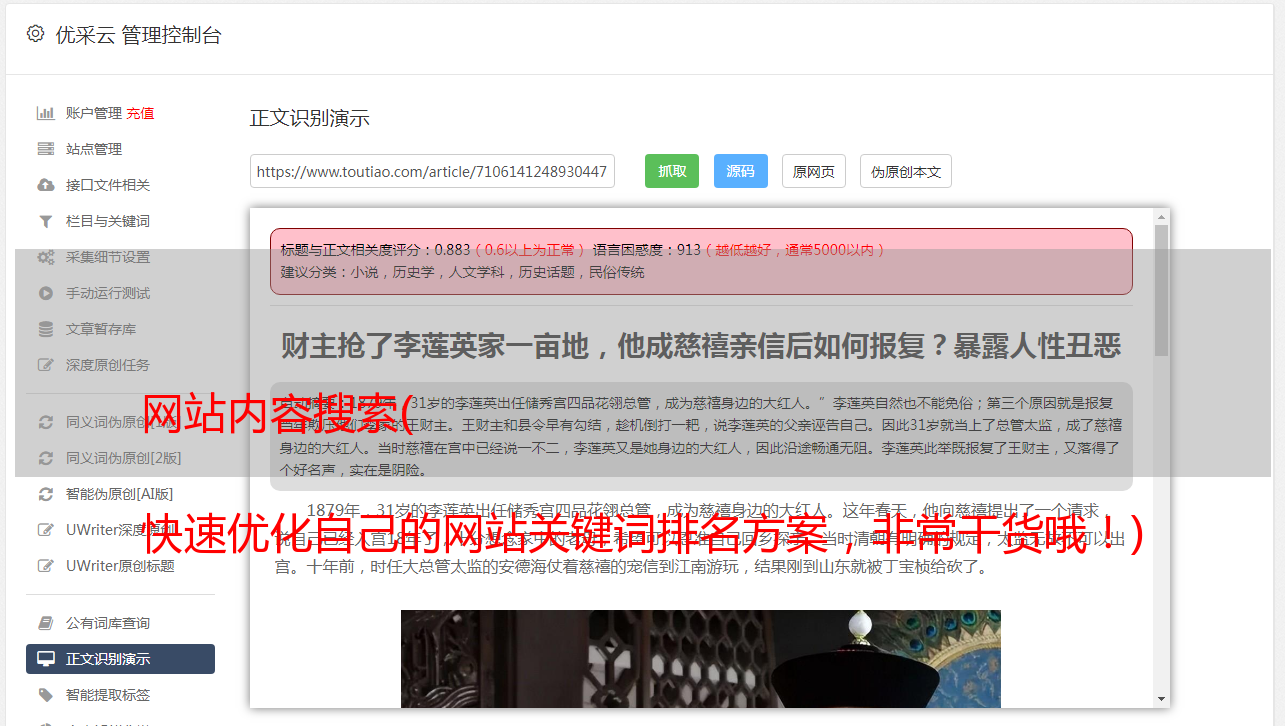 首先,需要对网站的核心关键词进行海量筛选。筛选工具在上一章中已经提到。可以使用金华站长工具、词追踪工具、百度索引、百度下拉框、爱站工具等,这些工具可以轻松帮我们挖掘网站长尾关键词@ > 大量。