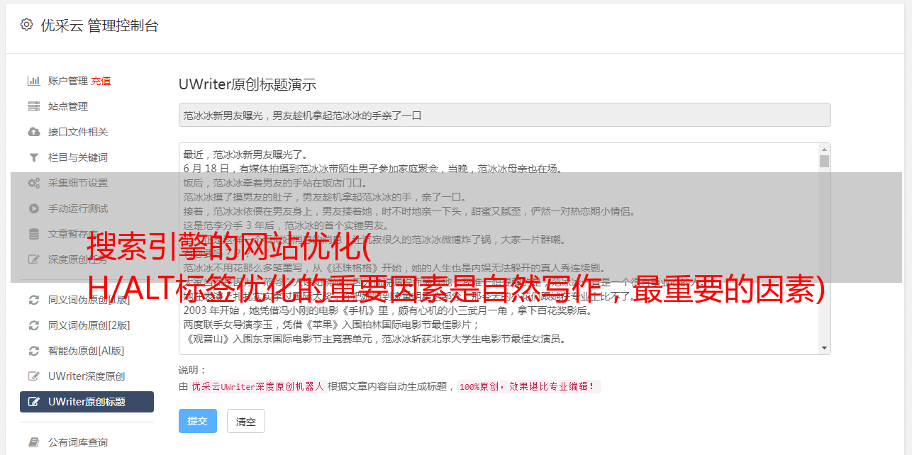 当然,H/ALT标签可以把关键字作为文章内容的焦点,但是在这些标签中,关键字不应该太多,有累积的嫌疑。一般来说,标签中收录2-3个关键字就足够了。此外,粗体、斜体等关键词也有一定的重视,但在页面写作中,最重要的是要自然。如果你觉得文章中的某个词需要强调,可以用粗体强调,不一定是关键词,这对文章很有帮助。