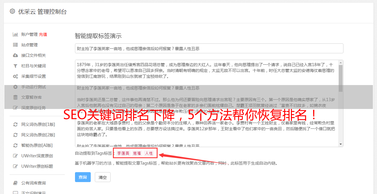网站排名主要由两部分组成,一个是关键词排名,另一个是应每天监控的长尾关键词覆盖率关键词排名。 关键词是您的核心。这主要用于监视网站中关键字的变化。如果关键词的排名发生很大变化,则表示您的排名在此周期内波动很大。排名监控可用于分析牛关键词的排名监控,并可记录一个月的排名数据。排名变化在一个月内就很明显。如果您发现排名发生重大变化,则需要分析上个月的网站日志以查看发生了什么变化并找出问题的原因。