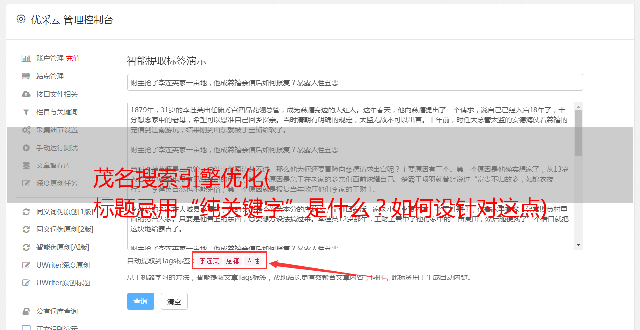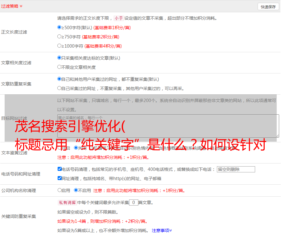 是否有屏蔽词库。这个非常重要。在搜索引擎中,很多词都被屏蔽了。这些词的出现很容易影响内容的收录问题。这必须认真对待。发表时间。通过我们的详细分析,搜索引擎什么时候容易收录。如果站系统支持定时发布,我们可以使用不同的时间段进行定时发布。另外,如果在凌晨之后定期发表一篇好文章,会大大减少采集被删除的数量。关键词 的选择。有效整合内容关键词可以提升个人关键词排名或提升长尾关键词排名。标题的选择。标题不是写的人多,那就证明搜索量越大,它将带来的流量越大。因为类似的标题会让搜索引擎厌烦,会引起搜索引擎的反感,所以不会是收录。因此,写一个非传统的标题更具创意和吸引力,而写同一个标题是有风险的。字数控制。一个人是很有耐心的,尤其是在这个浮躁的社会里。