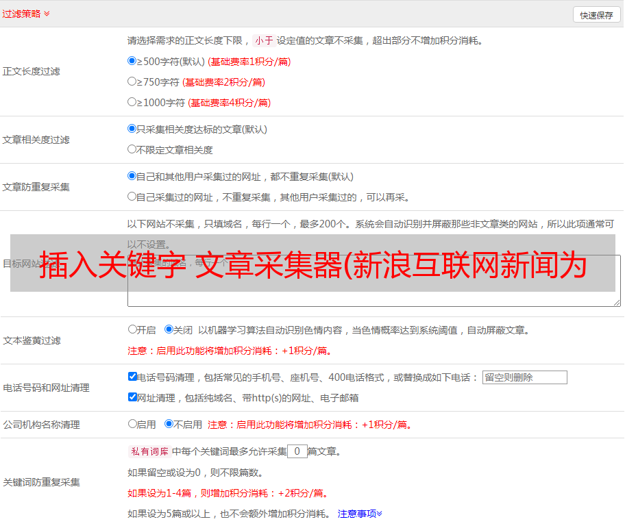 文章内容过滤功能,可以过滤掉文本中不需要的内容(如广告代码、版权信息等),可以设置两个关键词,删除两个关键词@ >、关键词2可以为空,表示删除关键词1之后的所有内容。