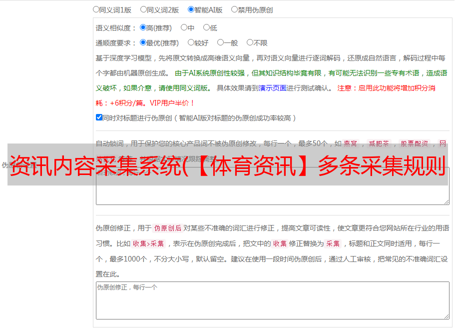 本插件可通过天人官方采集平台转入获取每日更新的文章(旧的文章不是采集)40多个类别的体育资讯,就是说能拿到全网海量实时更新的最新文章。可配合自动采集插件实现自动免维护更新网站功能。