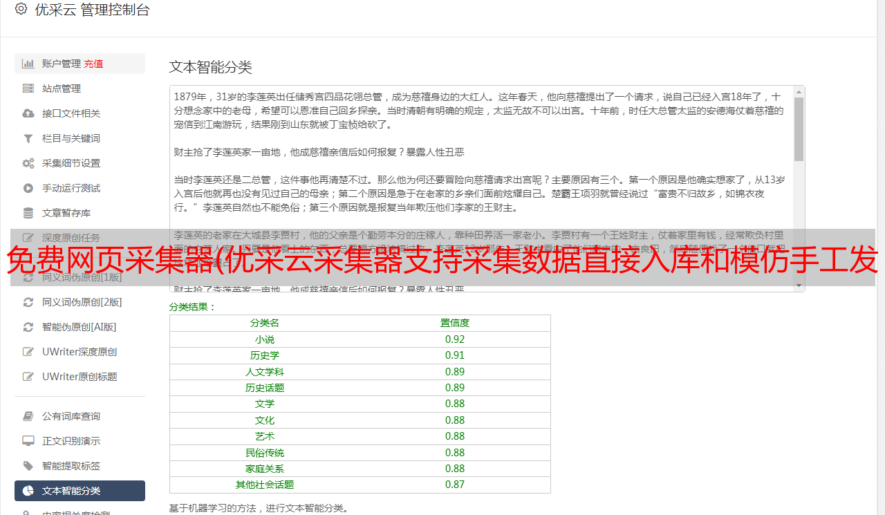 通过定义标签,可以对数据进行分类采集,如文章将内容的标题与文本分开采集。优采云采集器配置三种内容提取方式:前后截取、正则提取、文本提取。可选性强,用户可根据需要进行选择。