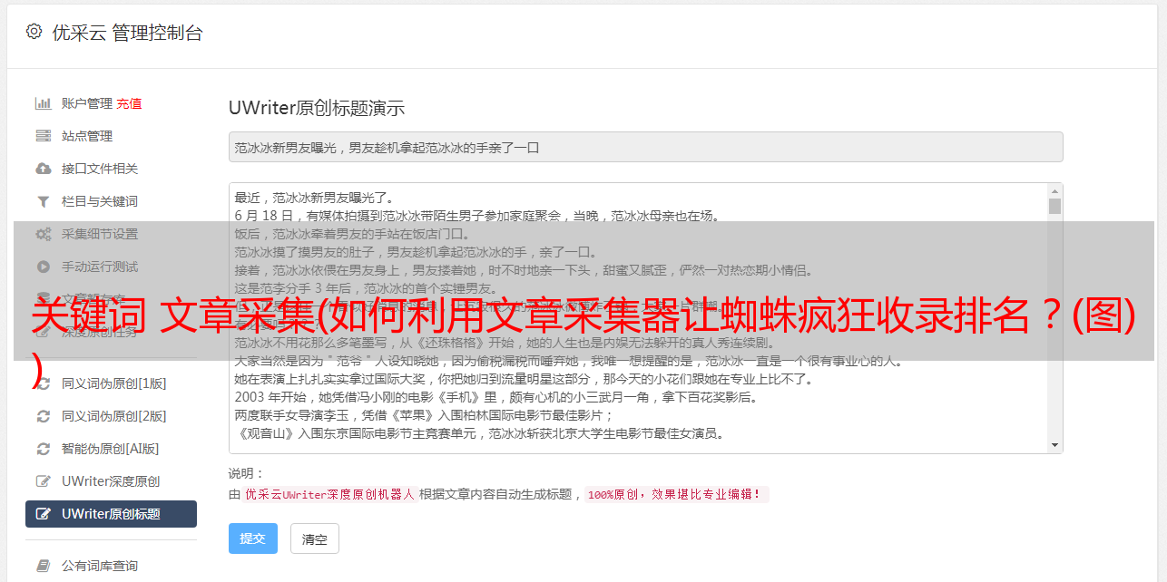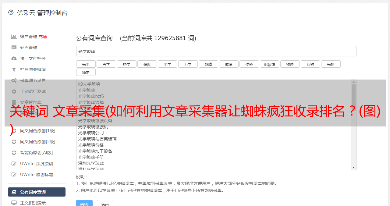优采云 发布时间: 2022-03-04 07:15关键词 文章采集(如何利用文章采集器让蜘蛛疯狂收录排名?(图)