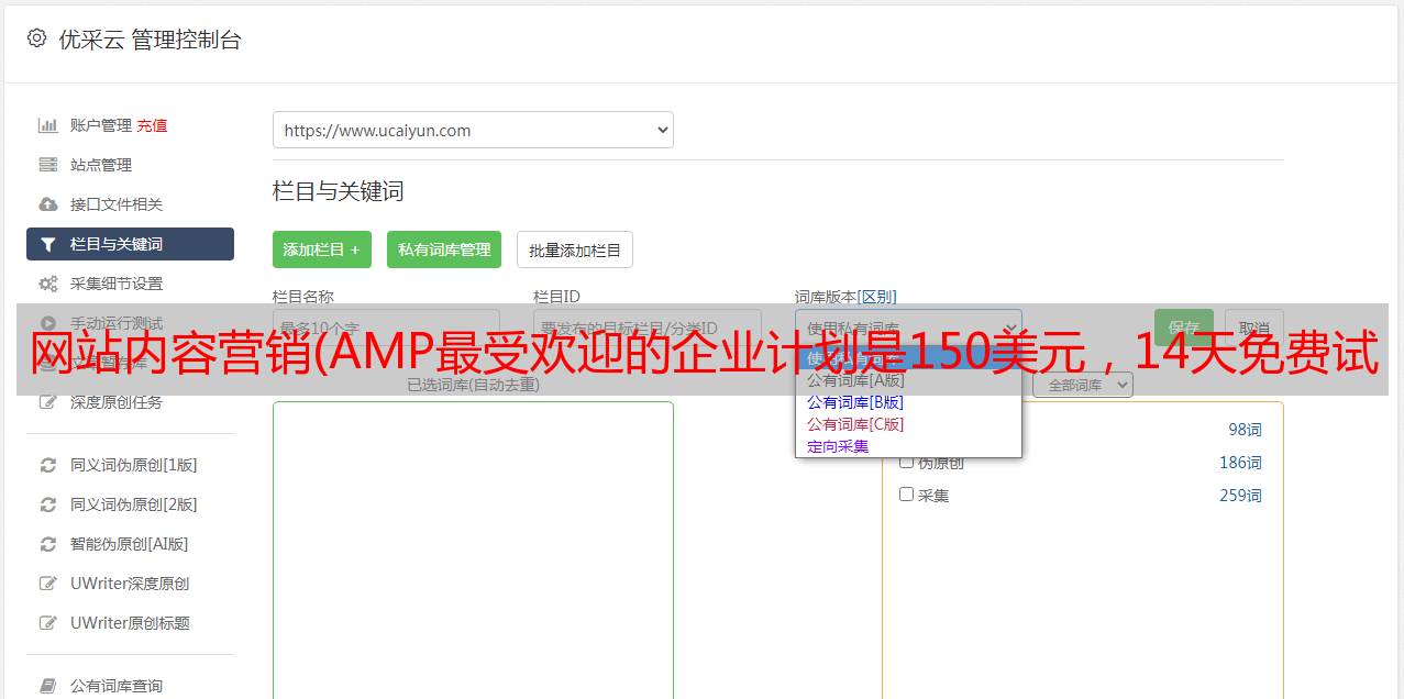 优采云 发布时间: 2022-03-04 10:10网站内容营销(AMP最受欢迎的企业计划是150美元,14天免费试用)
