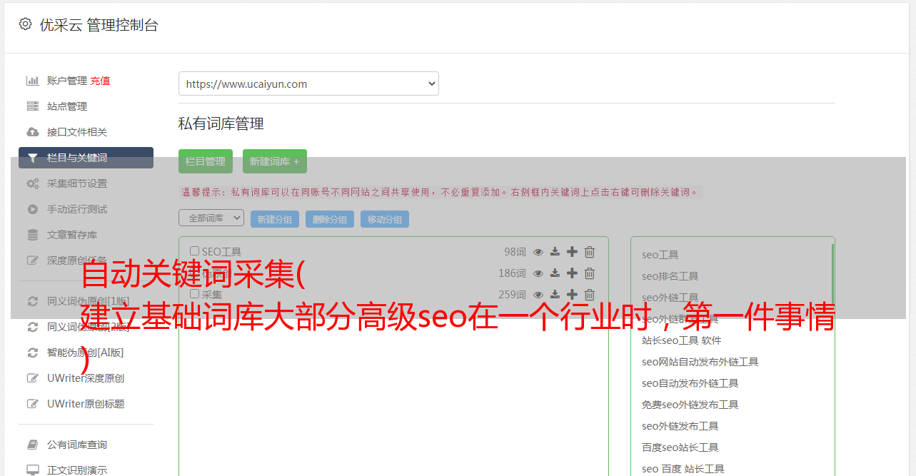 将这些关键词整理到我们自己的关键词管理系统中,有了庞大的基础关键词,我们就可以开始准备数据源了。