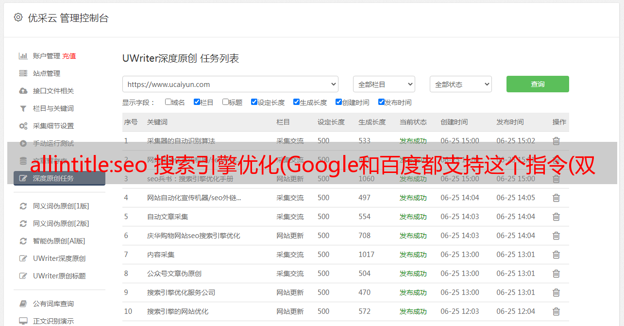 优采云 发布时间: 2022-03-07 10:00allintitle:seo 搜索引擎优化(Google和百度都支持这个指令(双引号)的页面)