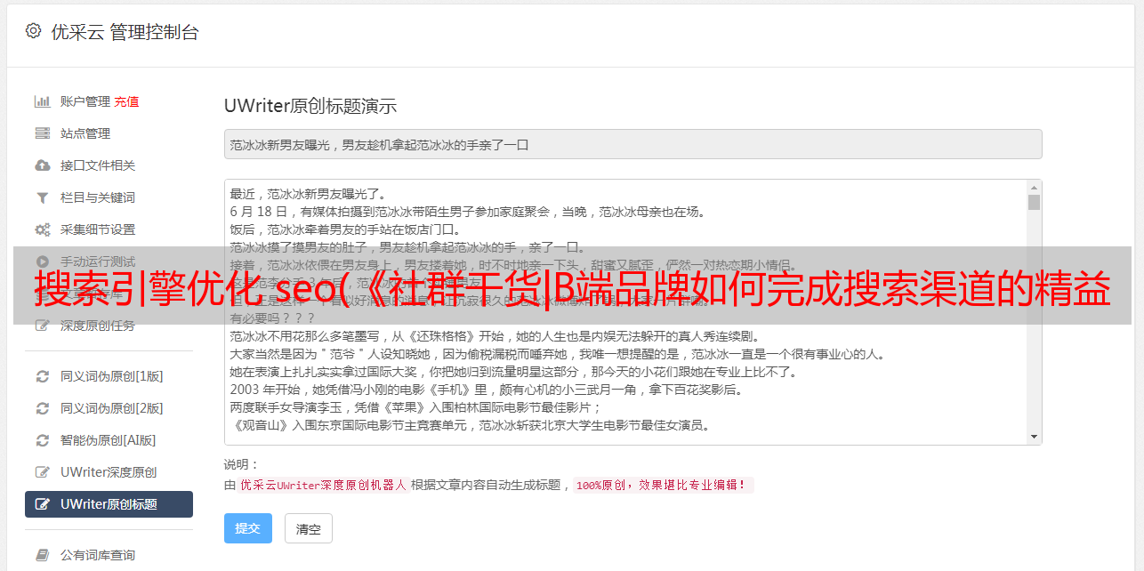 4.贴近渠道性质,定义相关推广维度。拿到相关行业词袋后,可以参考团队的调整方案、内容输出、手头资源量等,尝试改进网站。水平实现团队的共同成长。相关维护可以是内容收录的增量、关键词的排名效果、自然搜索的UV提升、最终渠道有效线索等。