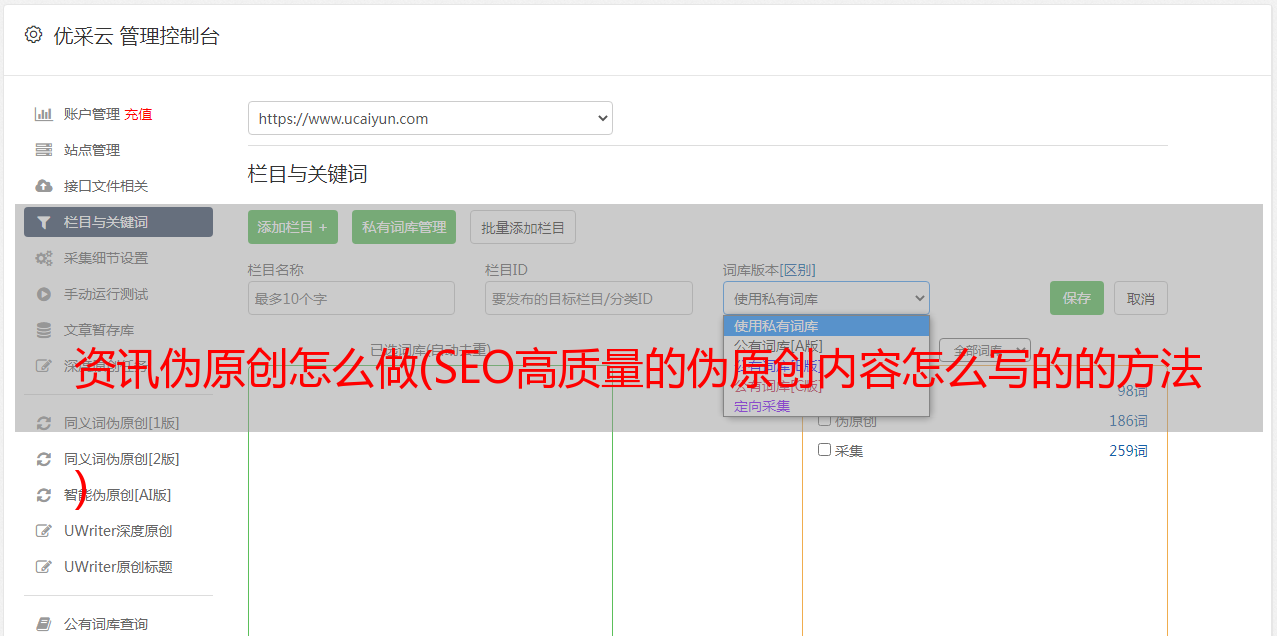 然后去官网获取伪原创词库,导入词库,选择“发布主题时自动伪原创”。好的,现在插件已经配置好了。