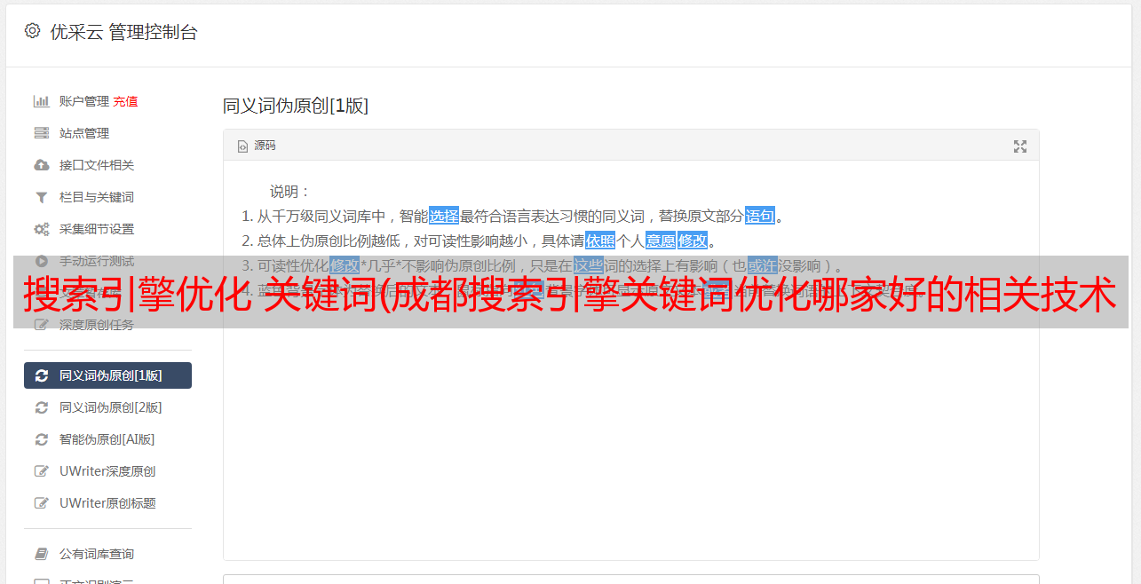 优采云 发布时间: 2022-03-13 02:06搜索引擎优化 关键词(成都搜索引擎关键词优化哪家好的相关技术成熟?)