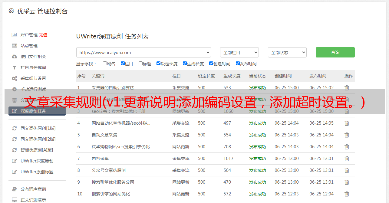 优采云 发布时间: 2022-03-13 06:11文章采集规则(v1.更新说明:添加编码设置,添加超时设置。)