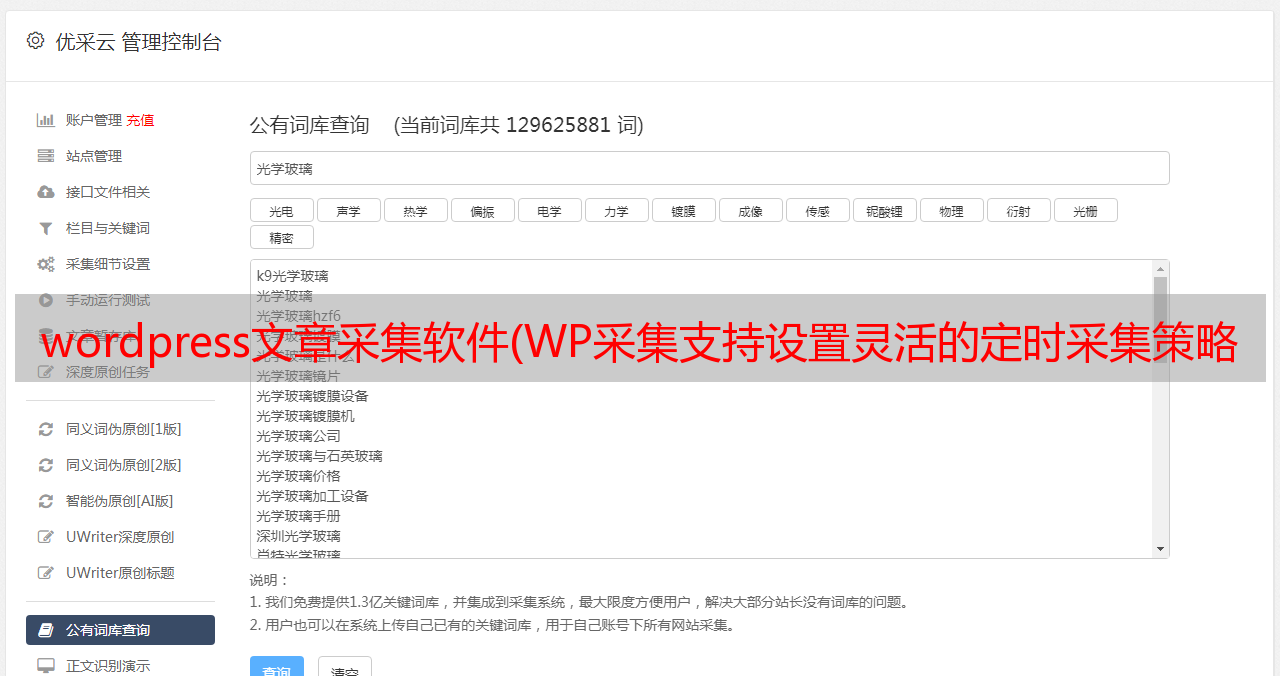 WP采集只需导入关键词采集相关关键词文章,WP采集可以同时创建几十个或几百个采集任务(一个任务可以支持上传1000个关键词),支持过滤关键词