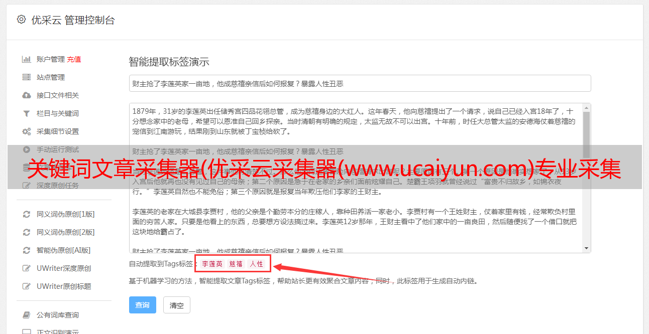 1.打开软件输入关键词即可实现全自动采集,多站点采集发布,自动过滤采集文章,与行业无关文章,保证内容100%相关性,全自动批量挂机采集,无缝对接各大cms出版商,后采集 自动发布推送到搜索引擎!