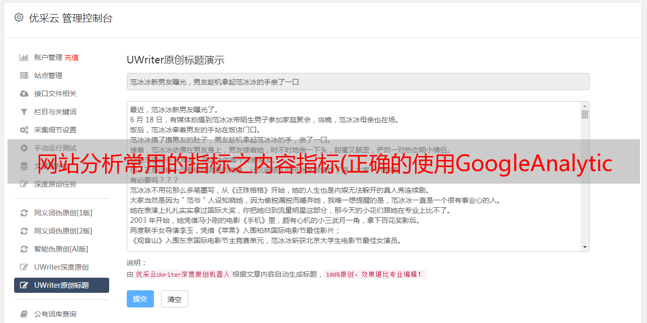 优采云 发布时间: 2022-03-17 02:21网站分析常用的指标之内容指标(正确的使用GoogleAnalytics报告是开始网站分析的。)