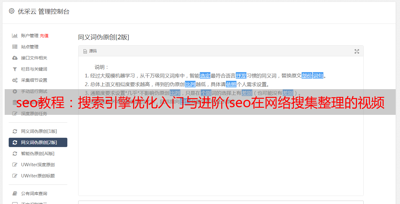 优采云 发布时间: 2022-03-17 13:16seo教程:搜索引擎优化入门与进阶(seo在网络搜集整理的视频资料,有意基础入门视频教程)