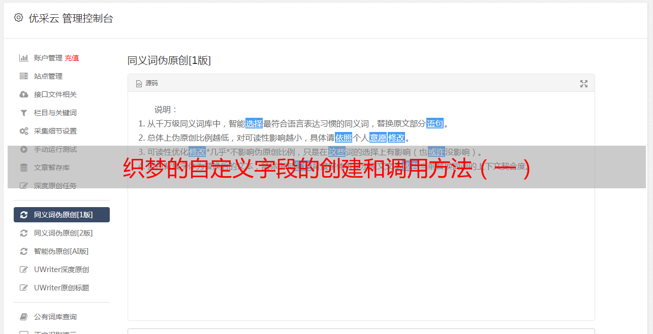优采云 发布时间: 2021-05-10 07:20织梦的自定义字段的创建和调用方法(一)
