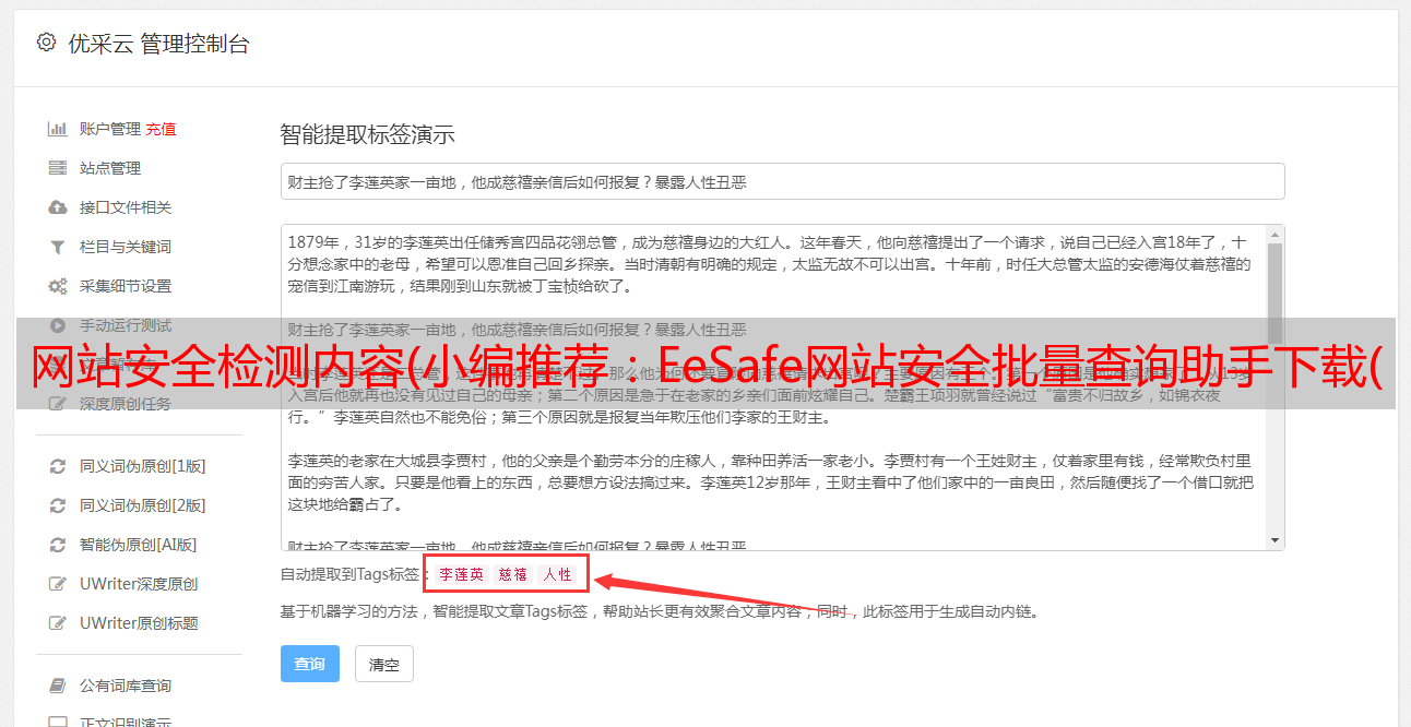 优采云 发布时间: 2022-03-18 08:21网站安全检测内容(小编推荐:EeSafe网站安全批量查询助手下载(组图))