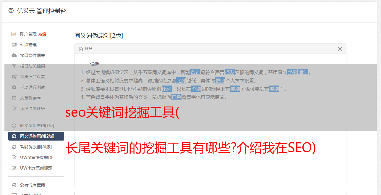 在描述中,关键词、文章必须出现'关键词挖矿工具'、'长尾关键词挖矿'、'SEO工具'等关键词字样,增加关键词的密度,也不是恶意堆砌,所以在使用相关词时使用上面的关键词。