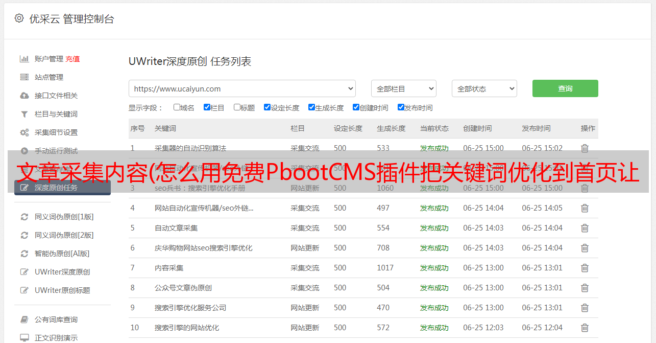 优采云 发布时间: 2022-03-18 17:06文章采集内容(怎么用免费PbootCMS插件把关键词优化到首页让网站能快速收录