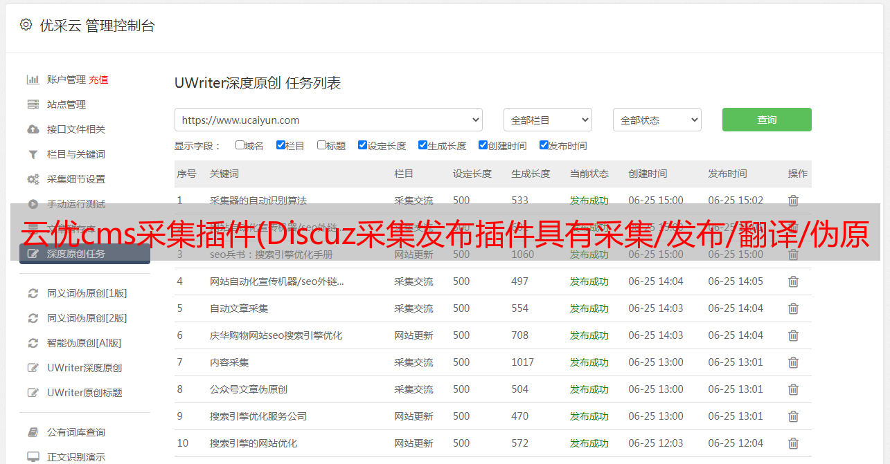 Discuz采集发布插件有采集/publish/translation/伪原创和全平台推送功能,可以实现对我们网站内容的全流程管理(如图所示)。自带SEO功能,在实现伪原创的同时,还增加了关键词密度、图片标注水印、随机作者等操作,提升原创,迎合搜索引擎偏好。收录.
