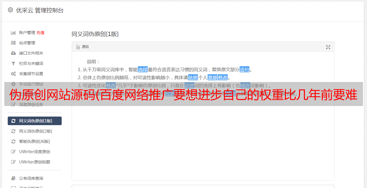 优采云 发布时间: 2022-03-19 09:00伪原创网站源码(百度网络推广要想进步自己的权重比几年前要难得多)