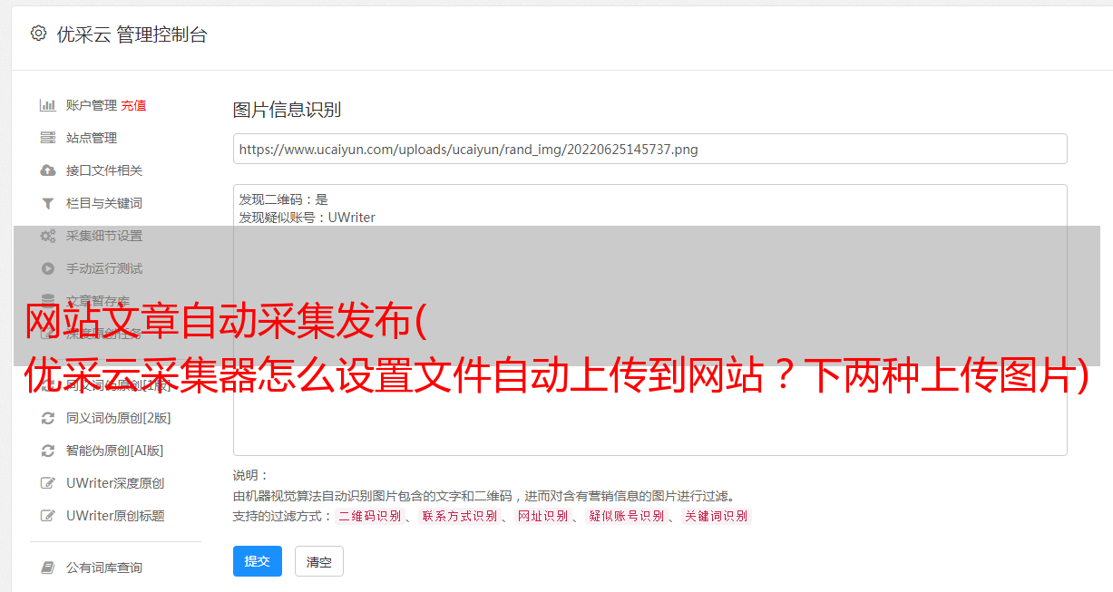 如果我这样写,则表示我的规则中的内容标签 采集 在结果中收录我要上传的图像文件。这里的设置要和规则设置一致,不能随便写。只需点击保存。