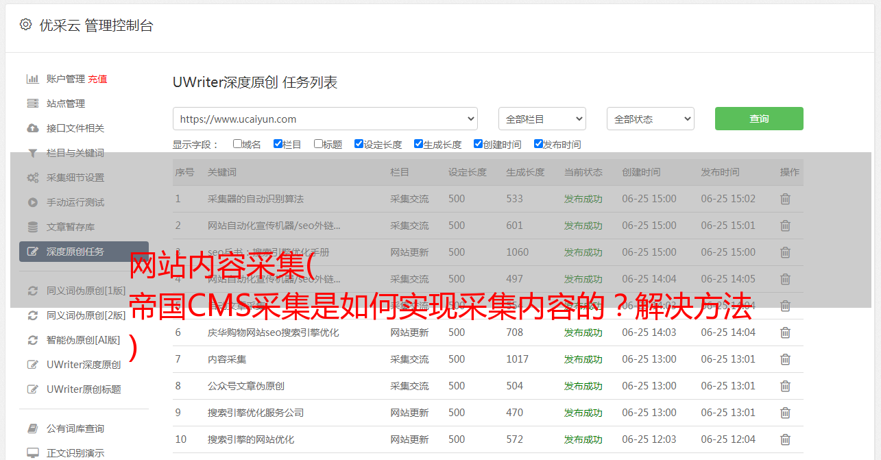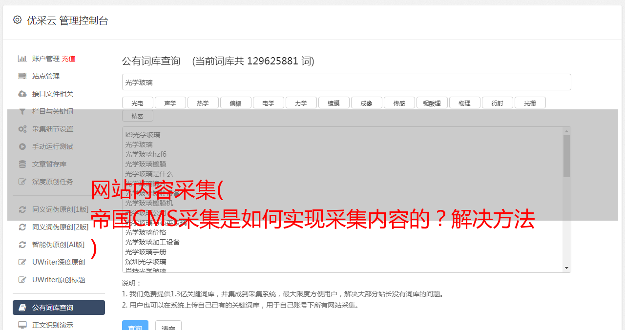 帝国cms采集是如何实现采集的,这里我就不和其他工具比较了,直接说一下它的特点。首先,操作使用非常简单,不需要编写采集规则,也不需要复杂的配置。二是使用成本降低,完全免费,不需要任何费用。第三个采集数据源丰富,可以实现全网采集,数据源多样化。四、采集配置SEO选项,采集时进行SEO优化,减少站长工作量,增加网站SEO优化。五、采集/伪原创/publish/push,一站式解决方案,让网站内容更新和网站优化更方便。第六,不仅帝国cms,各大主流cms同时支持。可以是单个站点,也可以是多个cms作为站群统一管理。