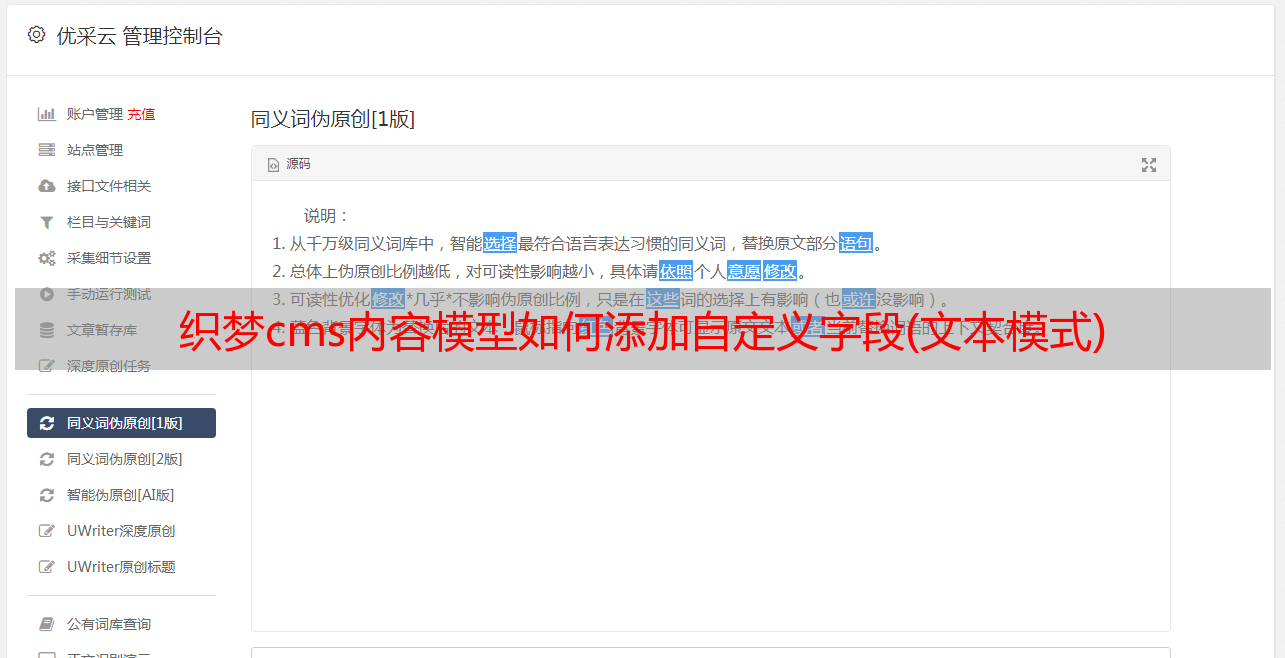 优采云 发布时间: 2021-05-11 02:20织梦cms内容模型如何添加自定义字段(文本模式)