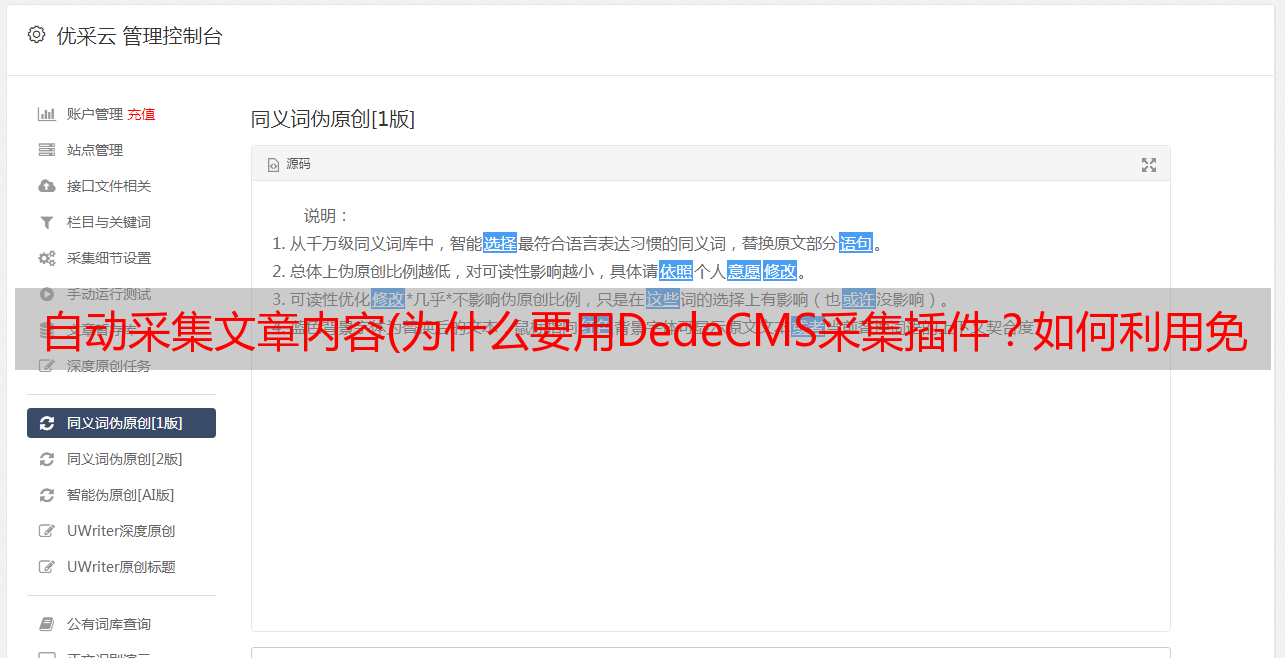 优采云 发布时间: 2022-03-20 20:13自动采集文章内容(为什么要用DedeCMS采集插件?如何利用免费dedeCMS采集让网站收录以及关键词排名)