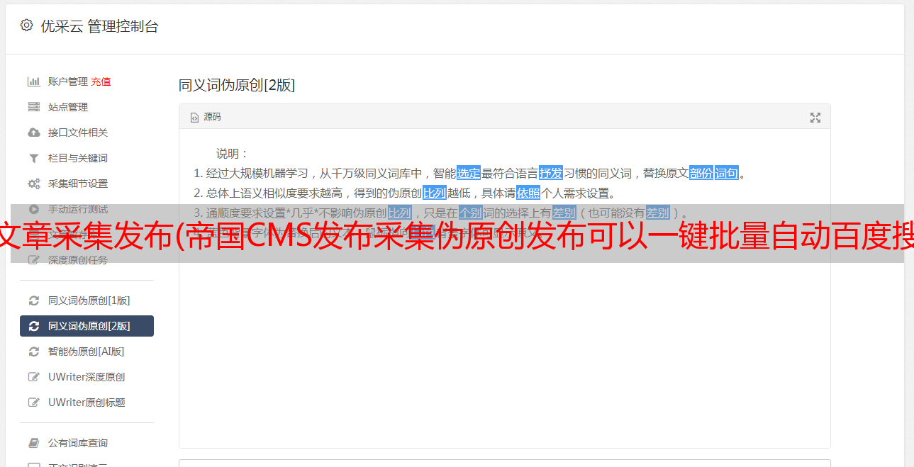 优采云 发布时间: 2022-03-20 23:11文章采集发布(帝国CMS发布采集伪原创发布可以一键批量自动百度搜狗神马360推送