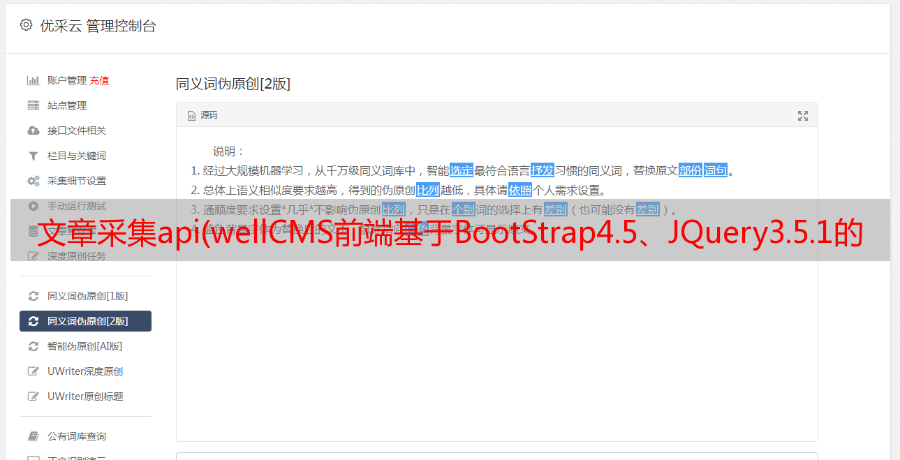 优采云 发布时间: 2022-03-22 02:39文章采集api(wellCMS前端基于BootStrap4.5、JQuery3.5.1的前端类库)