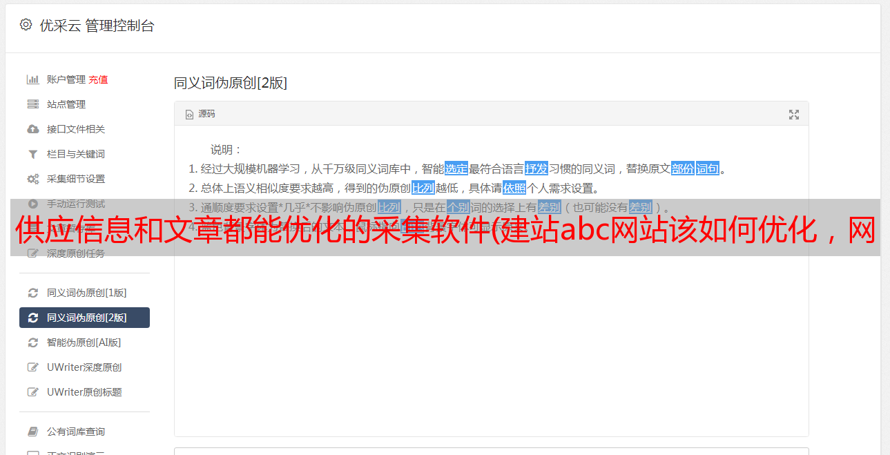网站abc网站管理软件有丰富的文章管理功能,无论是标题优化,还是文章图片,都有非常专业的优化选项,我们管理网站 文章二次创作的强大工具。