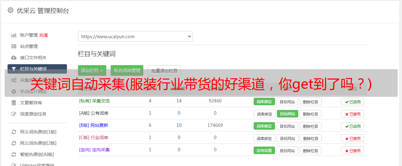 优采云采集器是云端根据用户提供的关键词自动采集关联文章并发布给用户的网站 网站 采集器。可自动识别各种网页的标题正文等信息,无需用户编写任何采集规则即可实现全网采集。采集到达内容后,会自动计算内容与集合关键词的相关度,只推送相关的文章给用户。支持标题前缀关键词自动加粗并插入固定链接自动提取Tag标签自动内部链接等一系列SEO功能。用户只需要设置关键词及相关要求,然后他们可以实现完全托管的维护网站内容更新。网站的数量没有限制,无论是单个网站还是*敏感*字*站群,都可以轻松管理。