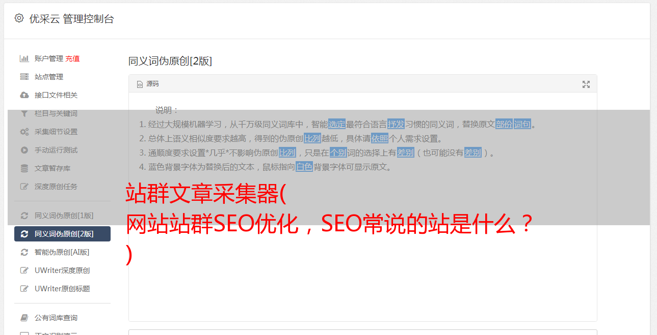 站群采集是做站群的一个很重要的部分。做站群的核心点是站群采集。网站站群SEO优化,SEO常说的站群是什么?顾名思义:就是一个人或者一个团队通过SEO技术操作多个网站,目的是通过搜索引擎获取大量流量,或者指向同一个网站的链接@> 来提高搜索排名。SEO站群是网站的集合,但必须统一、分级管理、信息共享、单点登录。站群通常由少则少,多则几千个网站组成,站群最简单的理解就是一组网站。而这些网站属于一个人,那么这些网站 被称为此网站管理员的 站群。SEO站群系统:站群,是网站利用搜索引擎的自然优化规则来推广和带来搜索引擎流量的一种方法。