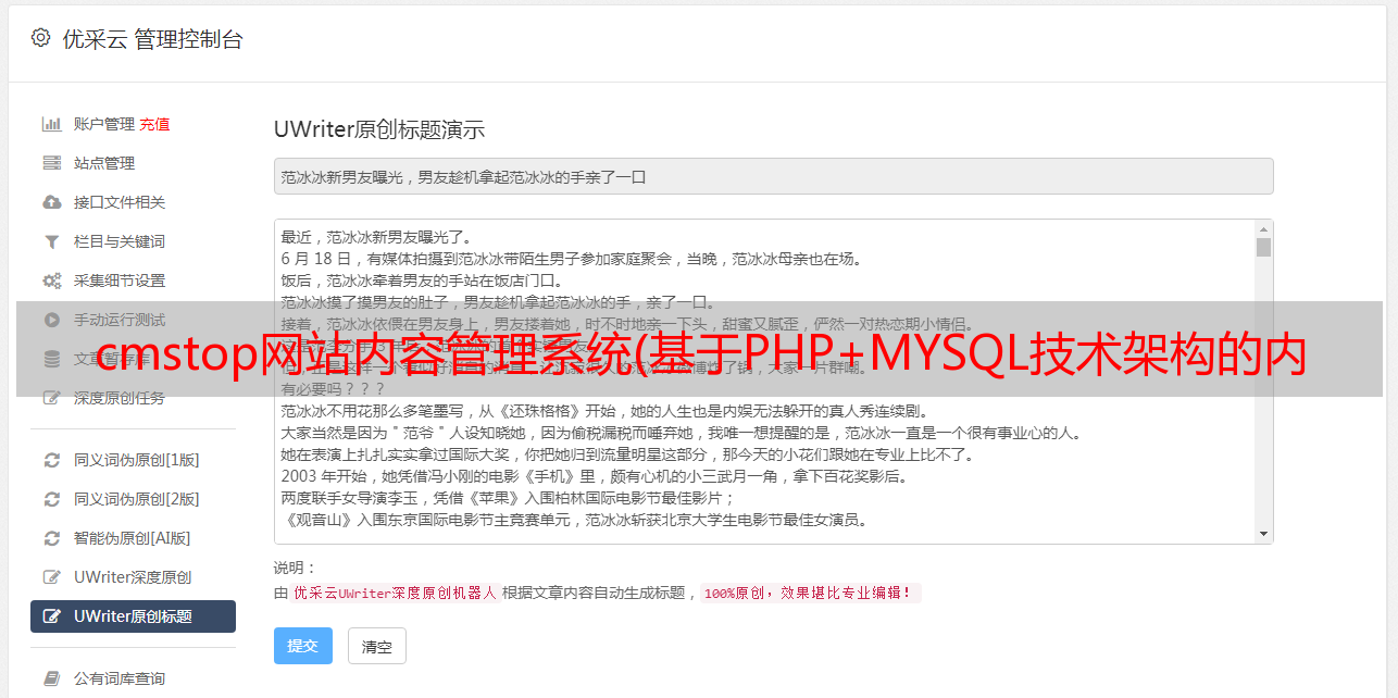 优采云 发布时间: 2022-03-23 22:17cmstop网站内容管理系统(基于PHP+MYSQL技术架构的内容管理系统,帮助传统媒体打造“全媒体”平台)