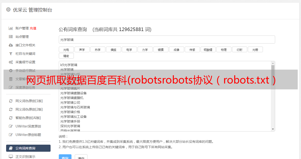 优采云 发布时间: 2022-03-24 10:02网页抓取数据百度百科(robotsrobots协议(robots.txt)Robots协议用来告知搜索引擎哪些页面能被抓取)