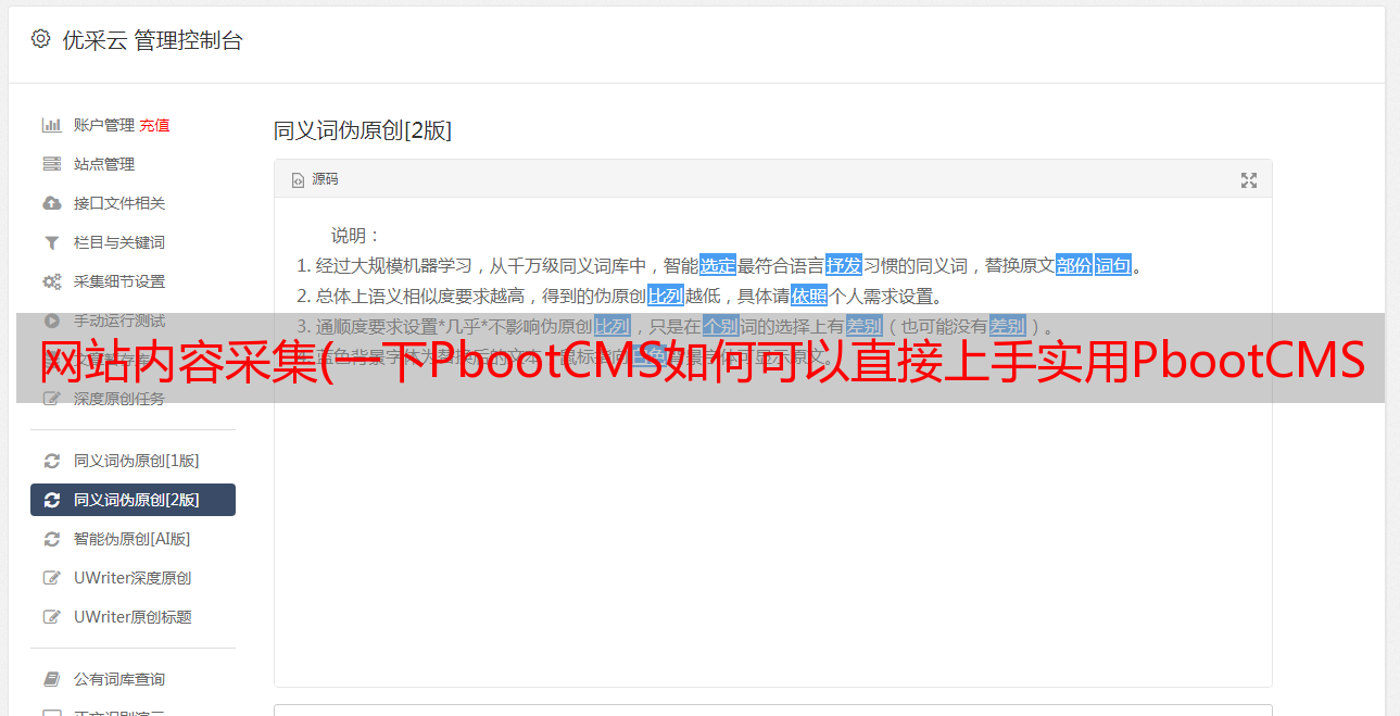 优采云 发布时间: 2022-03-26 04:20网站内容采集(一下PbootCMS如何可以直接上手实用PbootCMS采集,操作非常简单。
