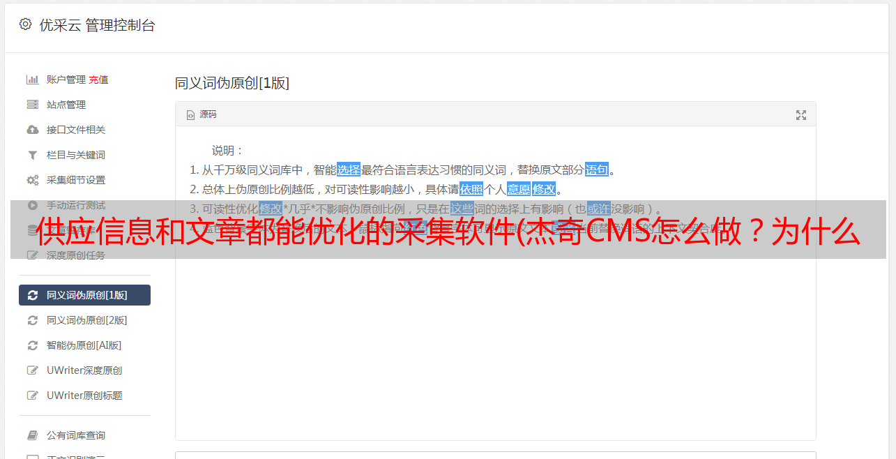 不管你有成百上千个不同的cms网站都可以实现统一管理。一个人维护数百个 网站文章 更新也不是问题。这个Jackiecms采集工具还配备了很多SEO功能,通过采集伪原创软件发布后还可以提升很多SEO方面。